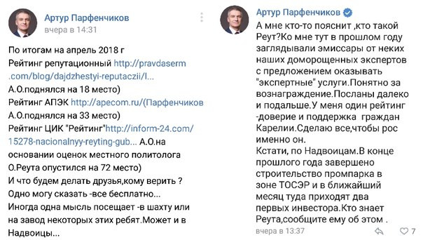 Так, например, в мае 2018 года глава Республики Карелия на своей официальной странице в социальной сети «ВКонтакте» обратился к автору этих строк: «Кстати, по Надвоицам. В конце прошлого года завершено строительство промпарка в ТОСЭР [территория опережающего социально-экономического развития] и в ближайший месяц туда приходят два первых инвестора. Кто знает Реута, сообщите ему об этом».