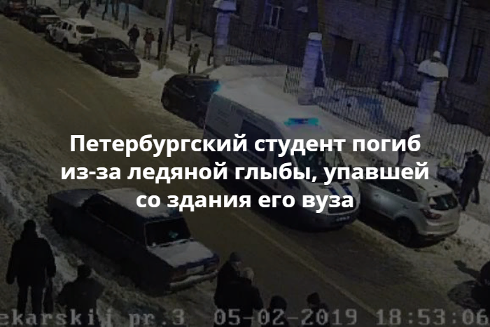 Днем 5 февраля, примерно в 15:05, глыба льда сорвалась со здания на Аптекарском проспекте, 6 и упала на двух студентов Петербургского химико-фармацевтического университета (СПХФУ). Один из них погиб на месте, второго госпитализировали в Мариинскую больницу.