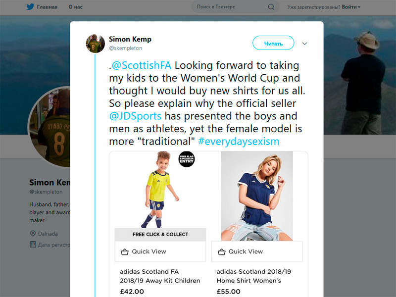 .@ScottishFA Looking forward to taking my kids to the Women's World Cup and thought I would buy new shirts for us all. So please explain why the official seller @JDSports has presented the boys and men as athletes, yet the female model is more "traditional" #everydaysexism pic.twitter.com/V2XsVKHiri