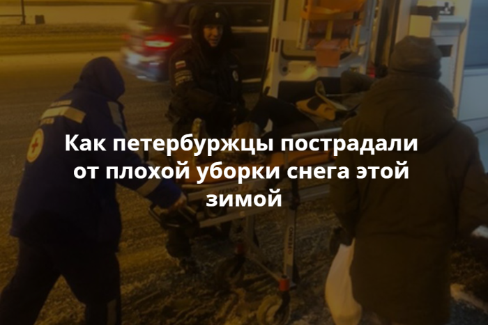 Ежедневно скорая помощь развозит по травмпунктам и поликлиникам Петербурга до 90 человек, пострадавших из-за снега и наледи на улицах. Только за первую неделю января травмы получили почти 400 горожан. 5 февраля в Петроградском районе погиб студент химико-фармацевтического университета Бабурбек Очилов — на него упала глыба льда с одного из корпусов вуза.