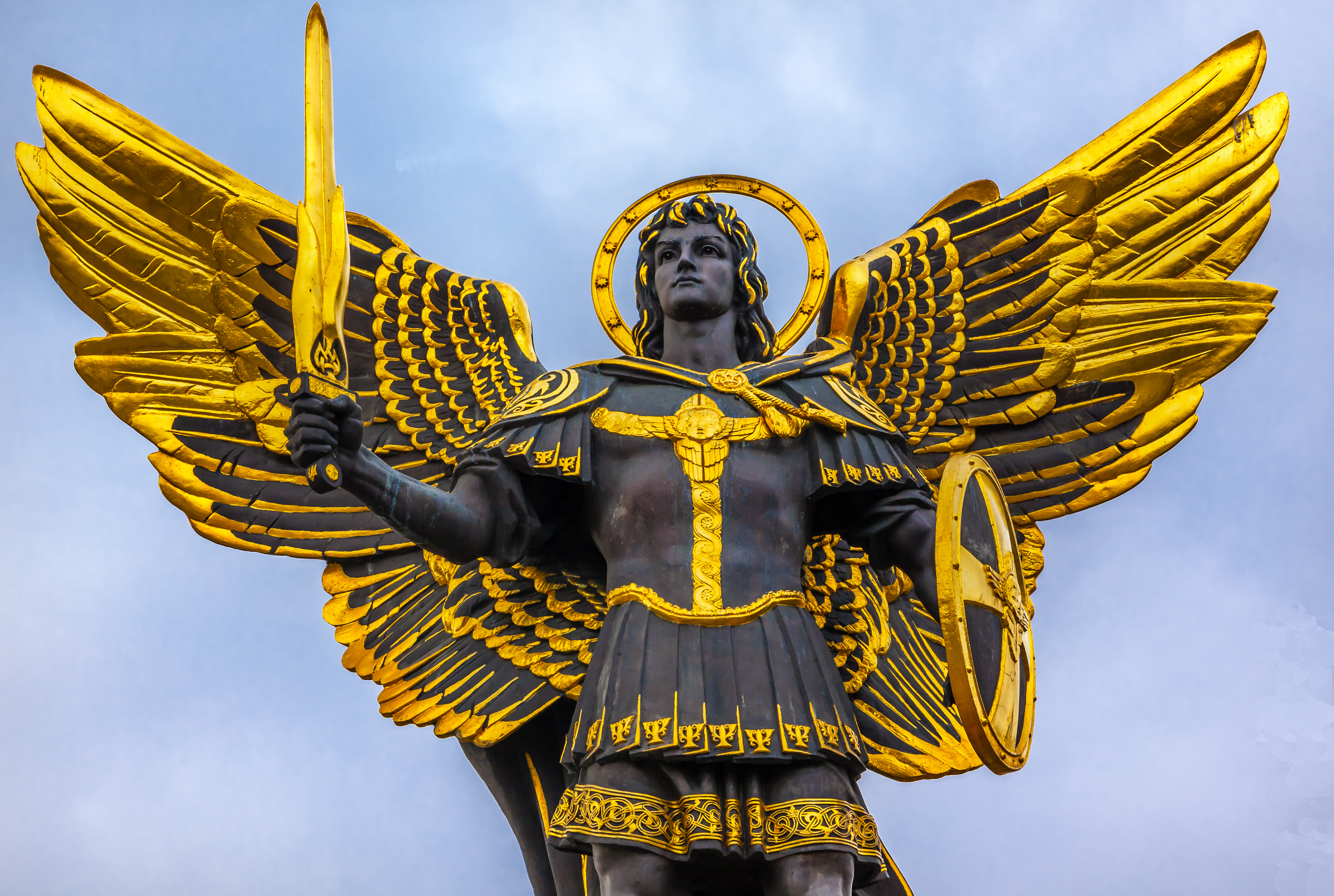 Архангел Михаил, в числе прочего, изображён на гербах Архангельска и Киева.