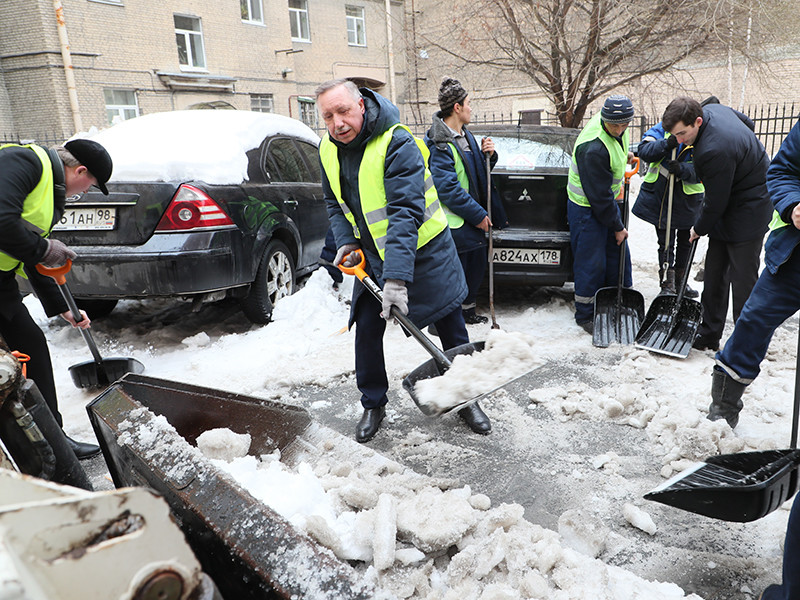 Врио губернатора Петербурга в компании подчиненных и бюджетников взялся за уборку улиц от снега и наледи (ФОТО)