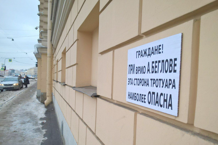Петербургские активисты установили на нескольких домах в центре города таблички с надписью «Граждане! При врио А. Беглове эта сторона тротуара наиболее опасна». Фотографии опубликовали в сообществе «Агит Россия».