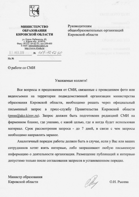 Министр образования нашего региона — госпожа Рысева издала указ, который запрещает фото, видеосъемку без согласования аж с Правительством Кировской области.