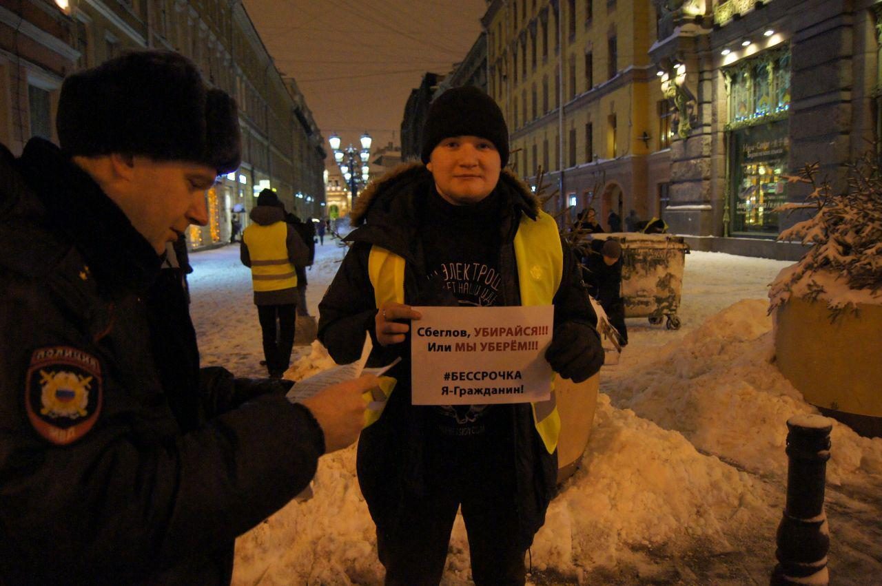 Участник акции «Бессрочный протест»Фото: телеграм-канал "Бессрочный протест СПб" По словам активистов, дежурившие на месте сотрудники полиции не препятствовали им и не задерживали протестующих, так как «не решились вязать людей за уборку снега». Меньше чем за час четырем активистам удалось очистить тротуары пешеходной улицы, поэтому они намерены продолжить проведение подобных мероприятий. Активист Гусев известен в городе не только как участник «Бессрочки», но и как градозащитник. Три года назад он выиграл конкурс «Твой бюджет» с инициативой по спасению города от сосулек, которые ежегодно калечат петербуржцев.