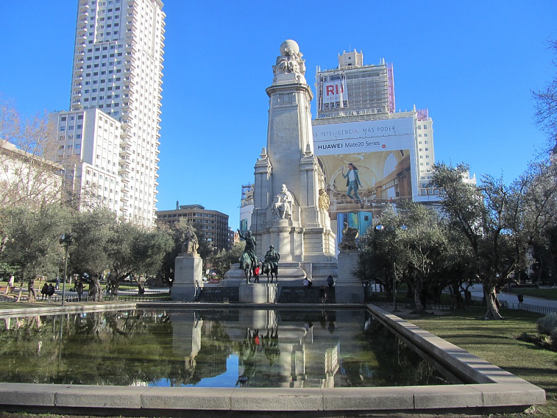 Разумеется, мы остановились возле памятника М. Сервантесу с изображениями его легендарных героев Дон Кихота и Санчо Пансы. Пожалуй, Дон Кихот — самый известный испанский персонаж для советских читателей моего поколения и, пожалуй, являющихся (наряду с корридой) одним из самых раскрученных (как сейчас говорят) «брендов» Испании. Фильм о Дон Кихоте, снятый замечательным режиссером Г. Козинцевым в 1957 году, до сих пор считается лучшей экранизацией этого произведения! Другие фильмы на ту же тему с ним и рядом не стояли! Правда, как литературный персонаж Дон Кихот до сих пор вызывает неоднозначные оценки критиков. Одни считают его романтиком, борющимся с несуществующими врагами, другие — обычным бездельником, прикрывающим свое нежелание трудиться «романтическими порывами». Кстати, именно так восприняли Дон Кихота многие образованные современники М. Сервантеса.