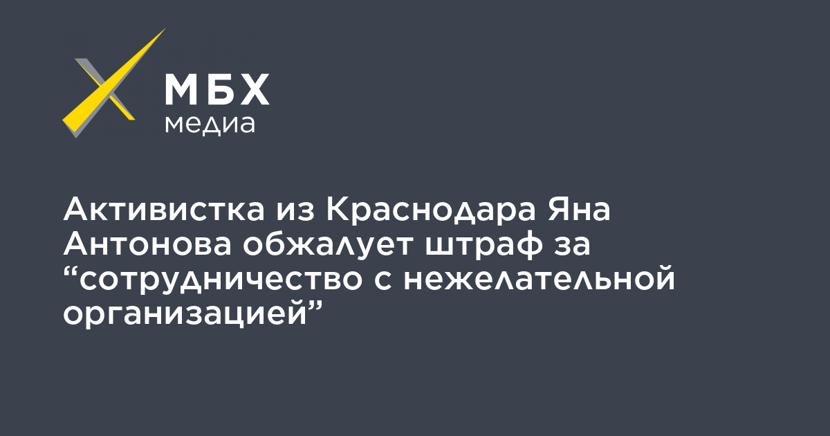 Координатор движения «Открытая Россия» в Краснодаре Яна Антонова будет обжаловать штраф за «сотрудничество с нежелательной организацией». Об этом она рассказала «МБХ медиа».
