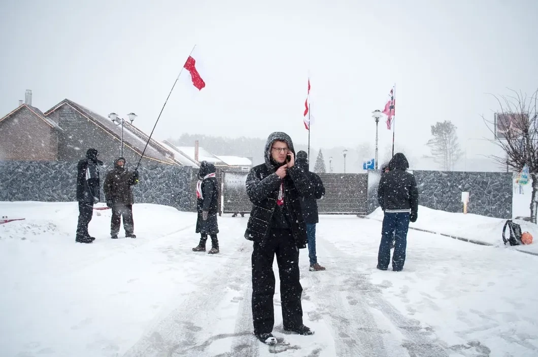 51-й километр МКАД. Минской кольцевой автодороги. На съезде — заправка и ресторан «Поедем и поедим». Идет сильный снег, но перед закрытыми воротами ресторана стоит несколько человек с бело-красно-белыми флагами.