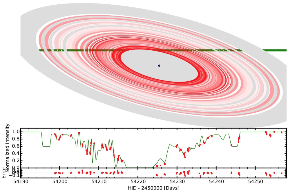 Исходя из кривой блеска вырисовывается модель колец и их транзита (рис. 1, верхняя панель, Kenworthy&Mamajek, 2015): почти полное затмение звезды длиной шесть дней в центре объясняется тем, что звезда скользила вдоль плотного кольца (хотя это не исключает, что есть еще кольца меньшего размера).