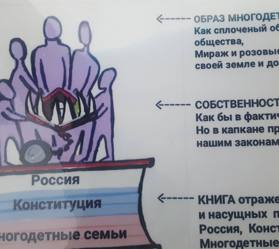 – Это образ многодетной семьи, он в сиреневых тонах, потому что семья мечтает о том, что все-таки сможет тут жить. Эта земля как бы у них в руках, это же их собственность, но она находится в капкане и прикована железными цепями к нашим законам, – описывает Татьяна Никифорова будущую скульптуру.