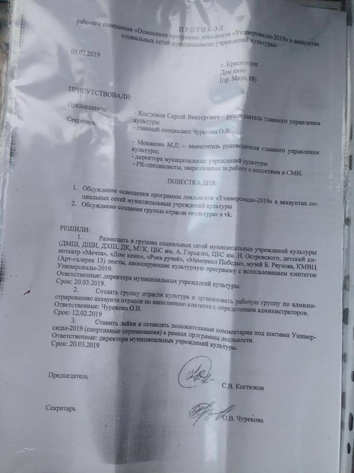 Между тем, в соцсетях появилась копия документа за подписью главы городского управления культуры Красноярска Сергея Костюкова, в котором он, в частности, предписывает своим подчиненным - сотрудникам муниципальных учреждений культуры - ставить лайки и "оставлять положительные комментарии" под постами, посвященными Универсиаде. Ответственность за выполнение поручения возложена на руководителей данных учреждений.
