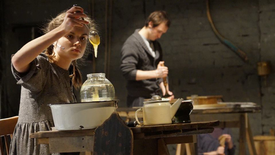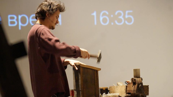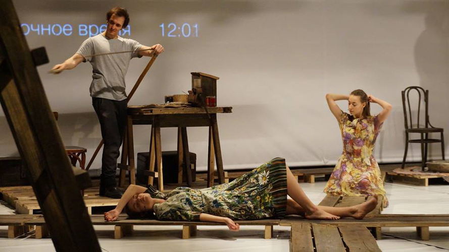 © Николай Кириллов У художницы Ксении Перетрухиной сцена обрамлена деревянными настилами и пересечена неправильными их диагоналями. В деревнях эти настилы — единственная возможность не ходить по колено в грязи три времени года. На деревянных крошечных площадках сидят молодые артисты «Театра-Театра» — их шестеро: Алексей Каракулов, Марк Букин, Дмитрий Курочкин, Екатерина Вожакова, Кристина Мударисова и Екатерина Мудрая. В тусклом свете на экране неумолимо фиксируются секунды и минуты. Люди заняты обыденными делами. Мужчина вощит охотничьи лыжи. Женщина с навечно печальным поворотом головы моет ноги в тазу. Девушка греет руки о чайник. Другая вяжет. В углу на сундуке кто-то спит, укрытый шкурой. Зима. Точное время восхода и захода солнца отмечено на экране — и эти цифры ужасают: день так короток и сер, что в его тусклом свете вся жизнь заторможена. Иногда раздаются звуки. Их трудно распознать, но в них — бедная музыка деревенской жизни, создающая звуковой купол спектакля.