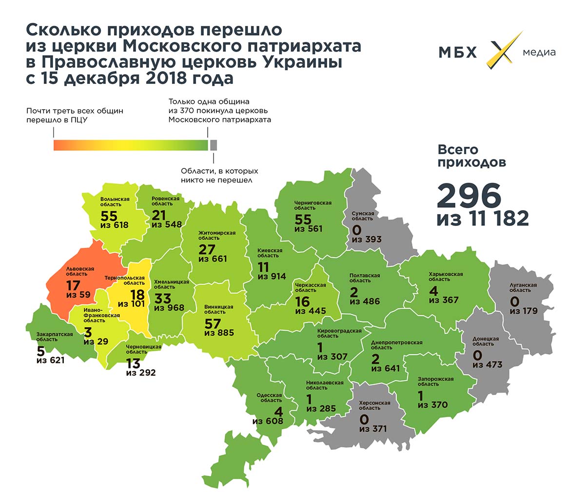 При этом есть ряд областей, где пока ни одна община Московского патриархата не перешла в ПЦУ: Донецкая, Луганская, Сумская и Херсонская области. Крымский полуостров, присоединенный к России в 2014 году, остается канонической территорией Украинской православной церкви Московского патриархата, там переходов в новую религиозную организацию не происходит.