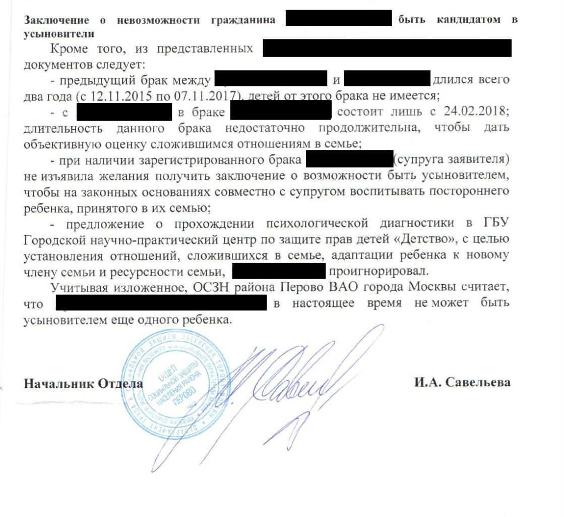 Несмотря на это, соцзащита района Перово в апреле 2018 года сделала вывод, что Александр не может усыновить второго ребенка. Среди доводов чиновников: брак Александра с женой недостаточно продолжителен — на тот момент около двух месяцев; усыновителем выступает он один, а не вместе с супругой; предложение пройти психологическую диагностику в подконтрольном соцзащите городском научно-практическом центре по защите прав детей «Детство» Александр проигнорировал.