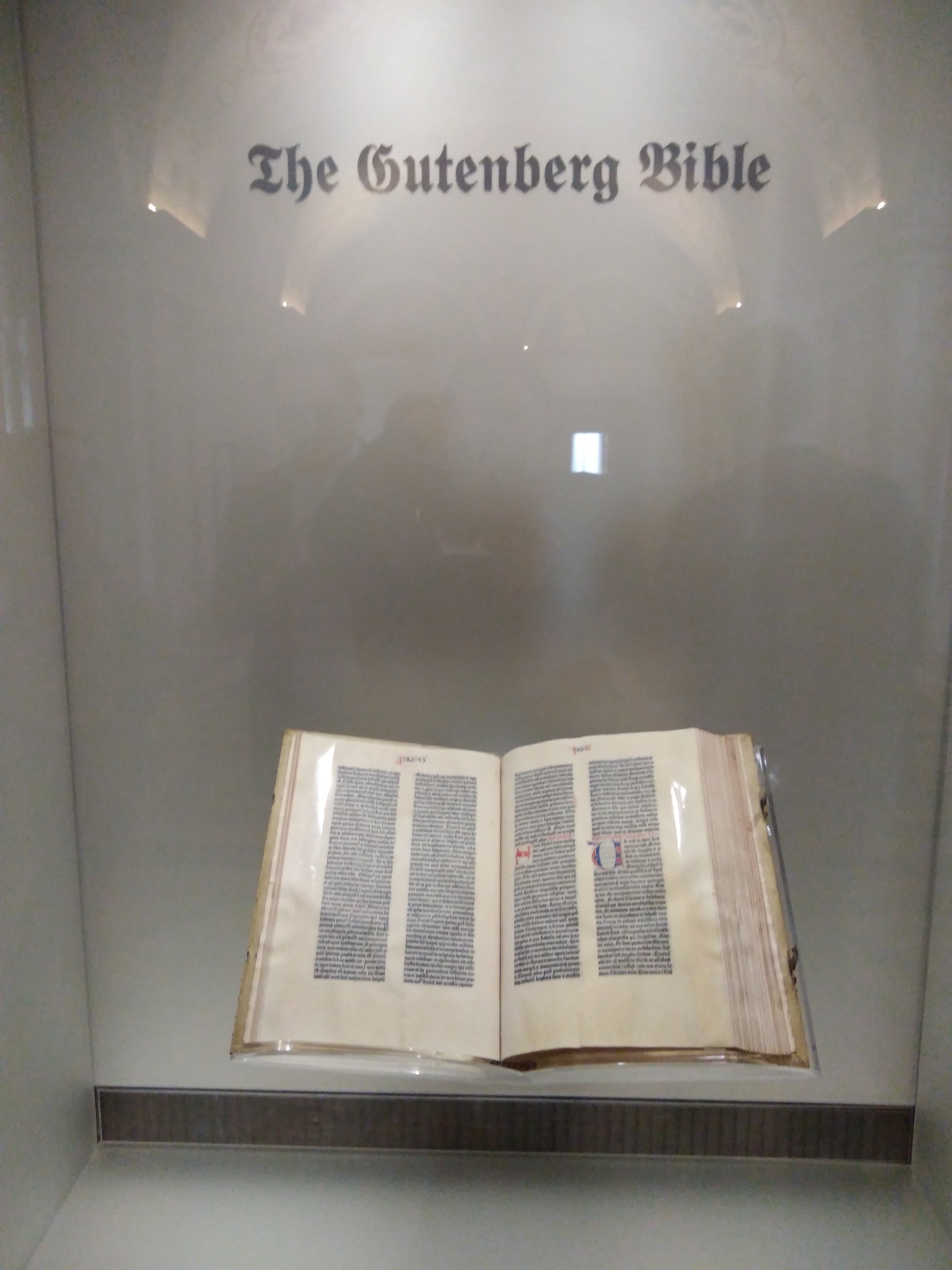 Знаменитая Библия Гутенберга стоит практически после входа в здание. Эта инкунабула традиционно считается точкой отсчёта европейского книгопечатания.