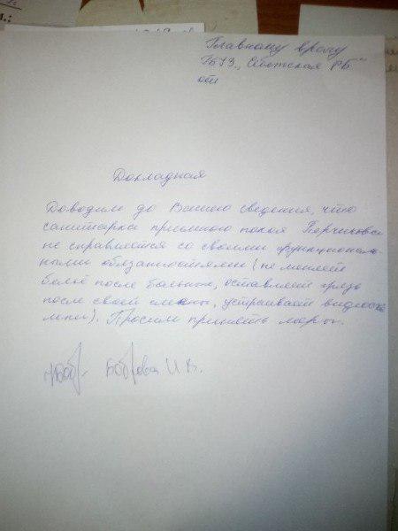 Коллеги-медсестры медийную известность Перчиковых тоже не оценили, прямо сообщили Елене Анатольевне, что будут на нее жаловаться, и слово сдержали. "Санитарка приемного покоя Перчикова не справляется со своими персональными обязанностями (не меняет белье после больных, оставляет грязь после своей смены, устраивает видеосъемки). Просим принять меры", – сообщил главному врачу Себежской районной больницы Андрею Захарову в официальной докладной один из медицинских работников. Под документом подписались несколько сотрудников.