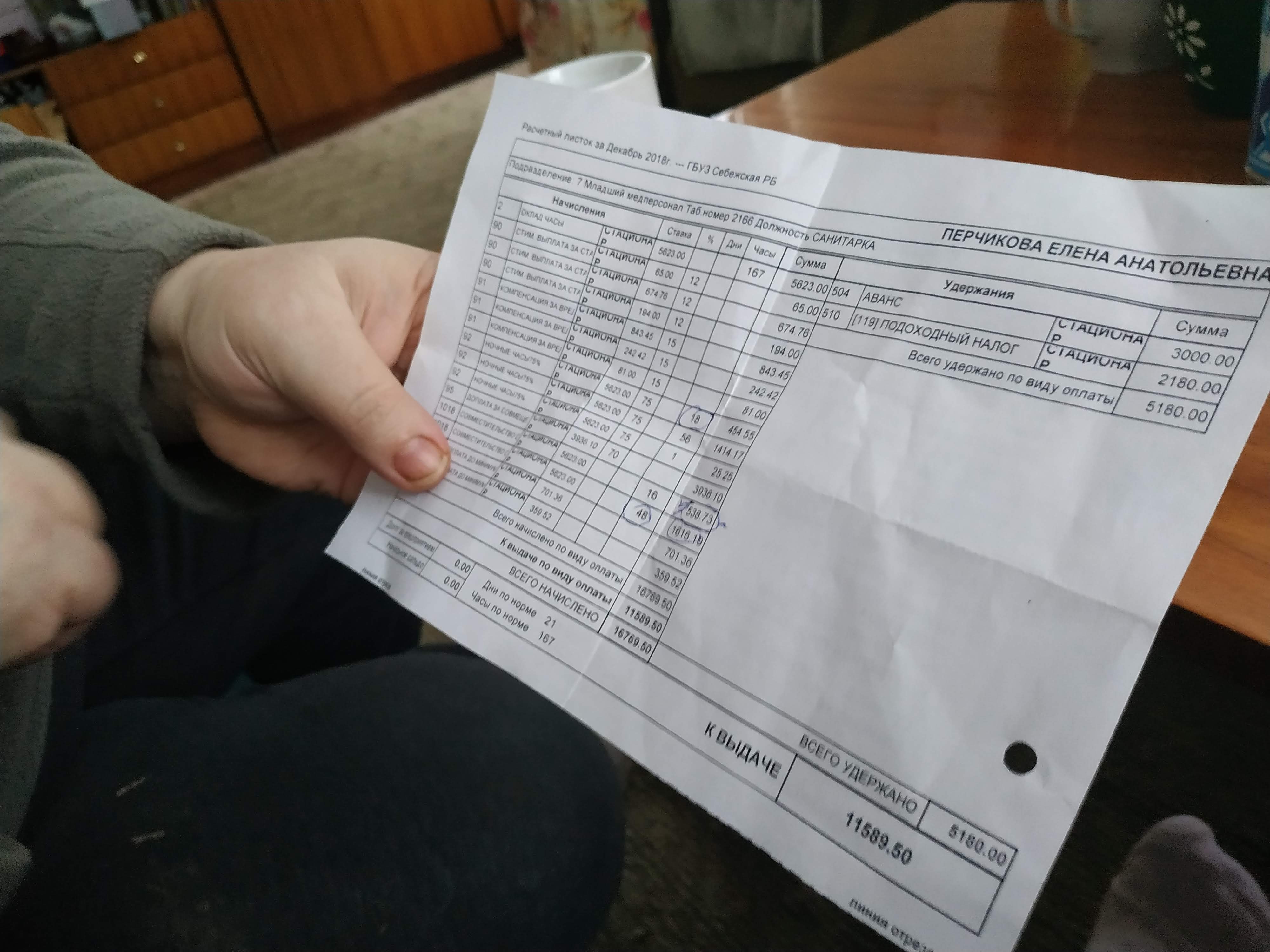 Елена Анатольевна таким словам удивилась. Она работает в Себежской районной больнице младшей медсестрой. Ее оклад – 5623 рубля. Это меньше установленного в Псковской области прожиточного минимума (тот равняется 11 163 рублям), поэтому в ее расчетном листке есть специальная графа "Доплата до минимума". Но та в декабре составила всего 700 рублей, поэтому Елена Анатольевна, по ее собственным словам, вынуждена работать за двоих: за санитарку и за медсестру приемного покоя одновременно. За это ей положено еще 70% оклада. Итого вместе с ночными дежурствами в реанимации в декабре ей набежало 16 769 рублей. После вычета аванса (3000 рублей) и подоходного налога (2180 рублей) в платежке осталось 11 589 рублей.