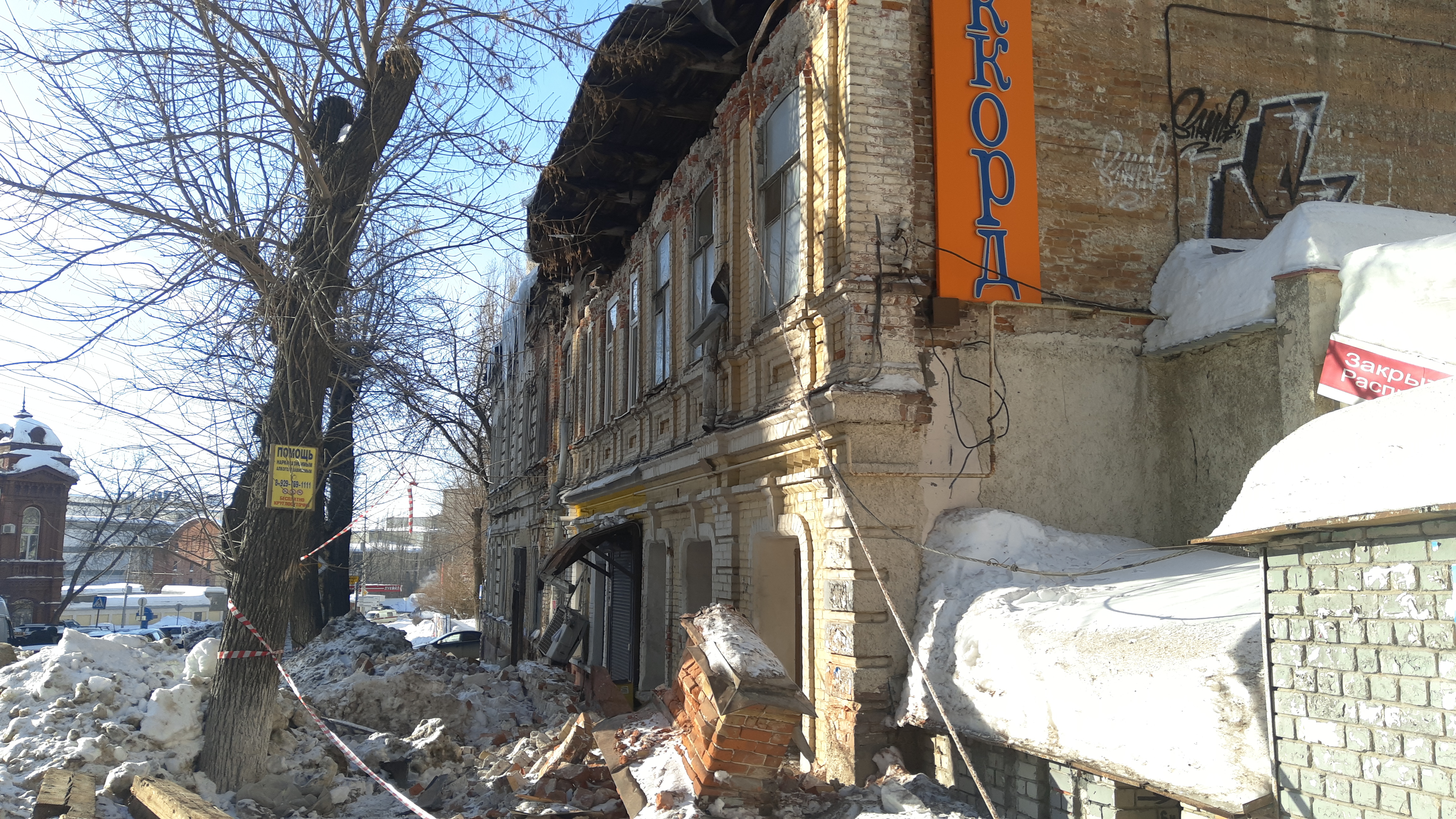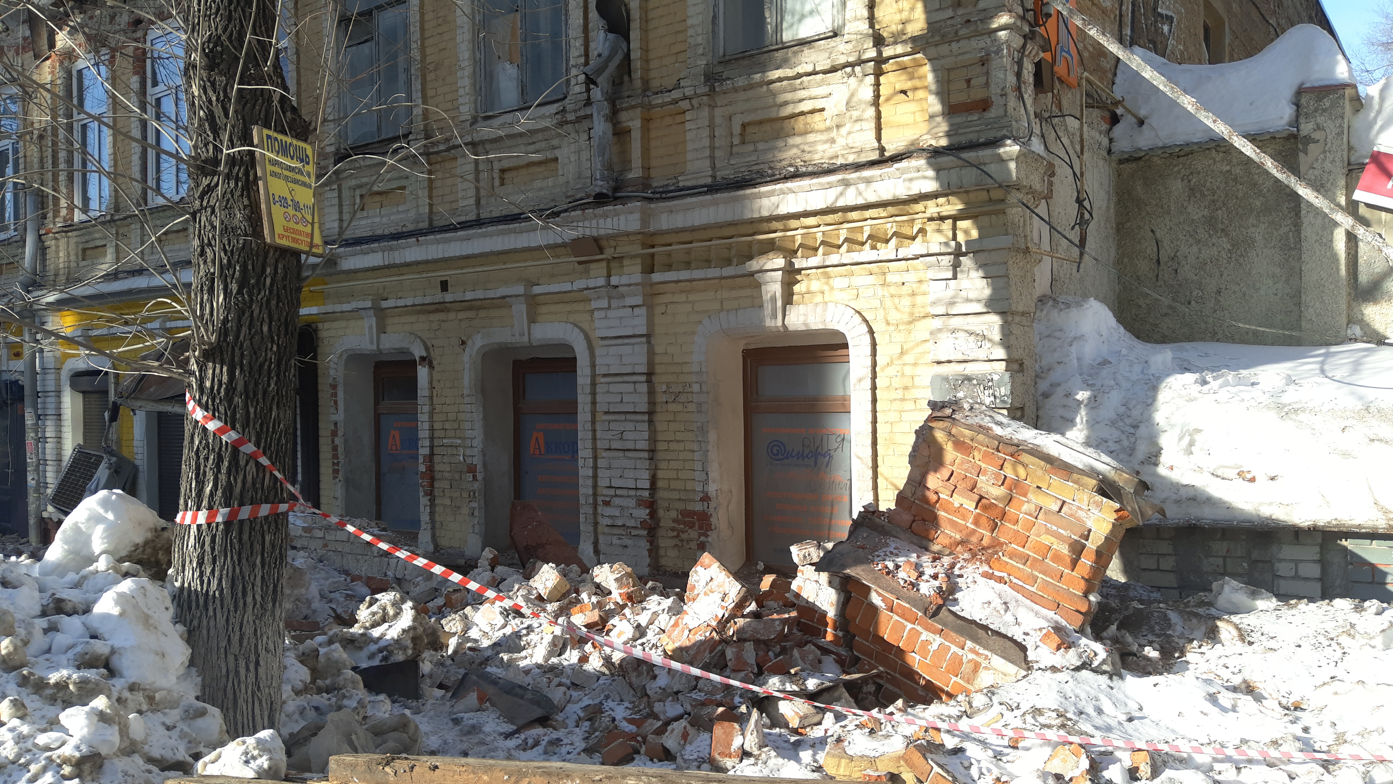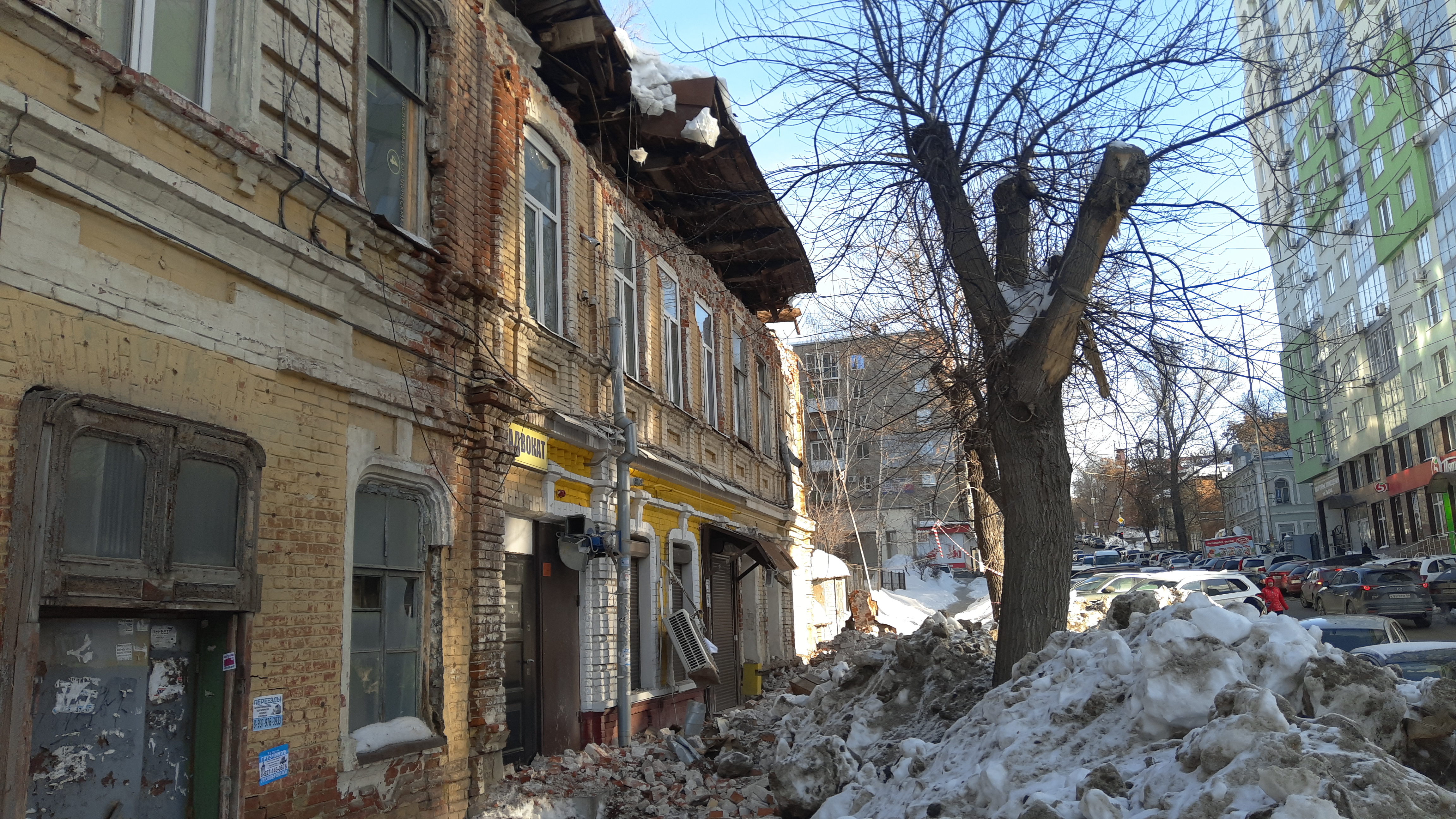 В центре Саратова у дома 5 по улице Радищева на тротуаре до сих пор валяются обломки стены. Крыша и часть кирпичной кладки обвалились еще 7 февраля, а тротуар до сих пор непроходим. Прочищен только проход к магазину на первом этаже – в тот день обломки кирпича буквально заперли внутри продавщицу, у которой уже начался рабочий день. Женщину вызволили. Теперь магазин закрыт.