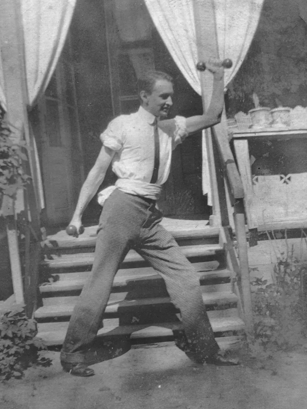 Коля Пунин занимается гимнастикой. Павловск, 1915 год