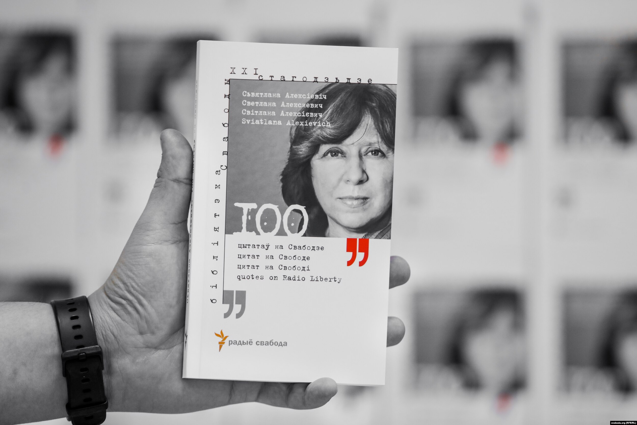 В издательской серии Белорусской службы Радио Свобода "Библиотека XXI века" вышел сборник цитат из интервью лауреата Нобелевской премии по литературе Светланы Алексиевич журналистам нескольких редакций медиакорпорации РСЕ/РС. Книга "Светлана Алексиевич: 100 цитат на "Свободе" включает в себя выдержки из выступлений белорусской писательницы в разных форматах в эфире и на сайтах Белорусской, Русской и Украинской служб 1993–2018 годов и даёт представление о художественных, политических, мировоззренческих взглядах лауреата Нобелевской премии по литературе. Цитаты из выступлений Алексиевич, для которой язык творчества – русский, приведены на четырёх языках, то есть книга предназначена также для белорусскоязычной, украиноязычной и англоязычной аудиторий.