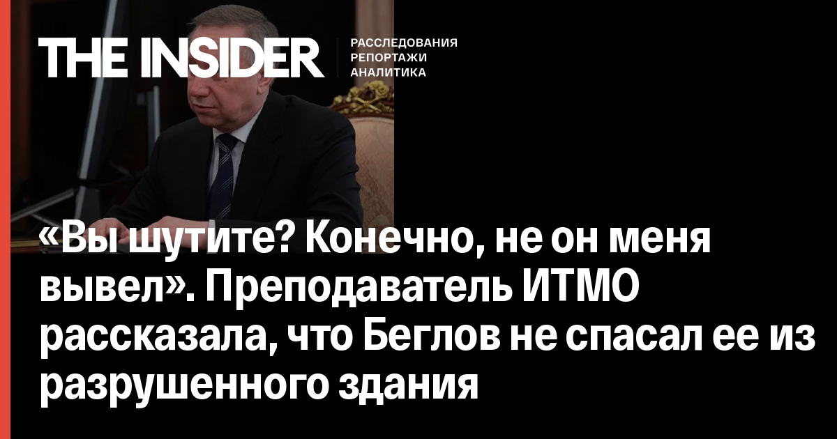 Наталья Серебрянская, преподаватель петербургского университета ИТМО, в котором 16 февраля обрушились несколько этажей, рассказала, что врио губернатора Санкт-Петербурга Александр Беглов не выводил ее из здания, как об этом сообщали некоторые СМИ. Об этом она рассказала Telegram-каналу BAZA.
