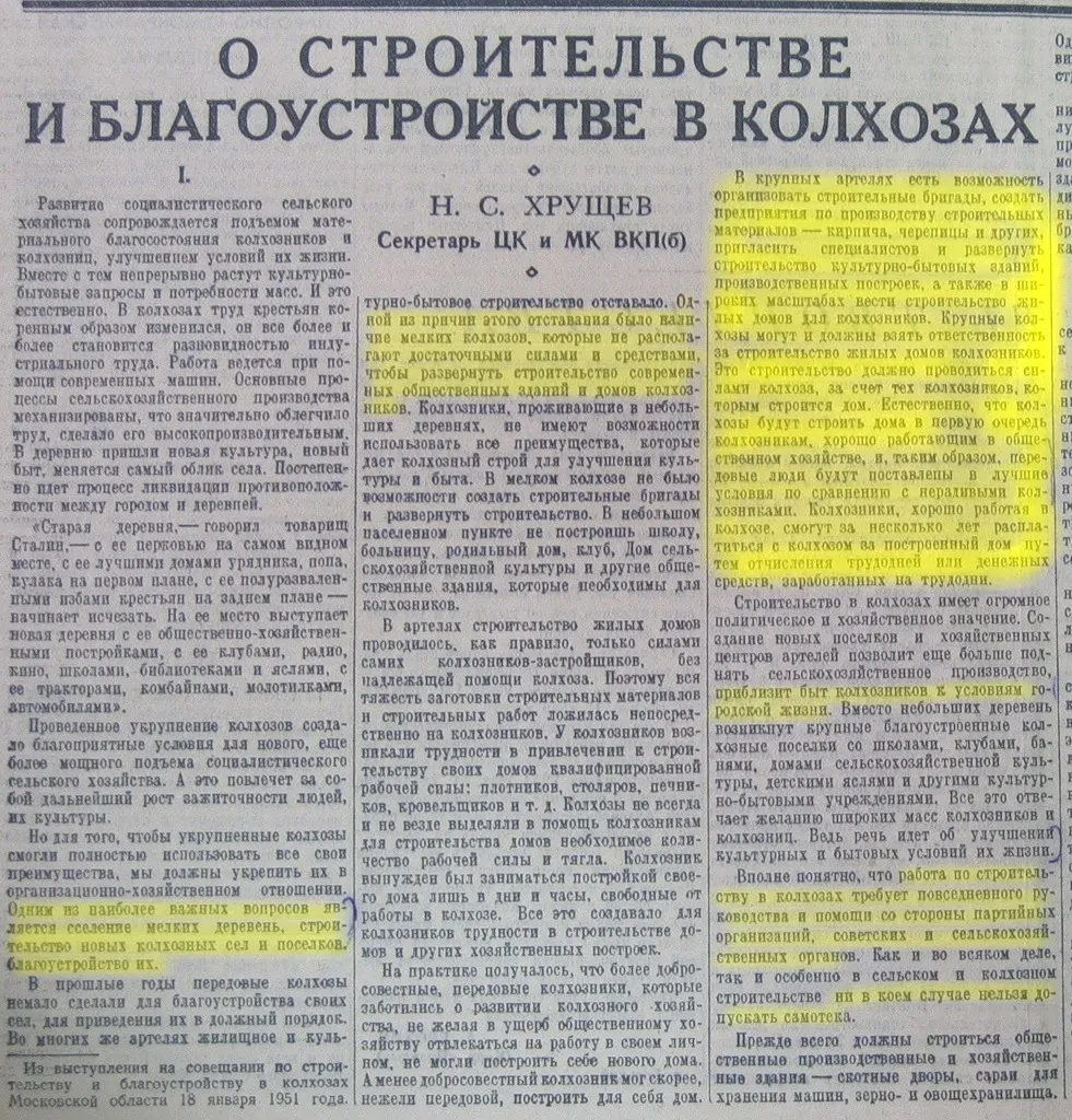 В марте 1951 года в «Правде» появилась статья члена политбюро, первого секретаря московского обкома и горкома Никиты Хрущева об объединении деревень и создании агрогородов с развитой инфраструктурой. Но публикации без санкции Сталина были крайне опасны.