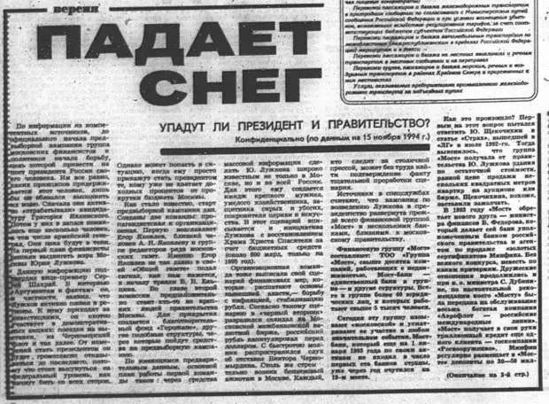 «Группа московских финансистов и политиков начала борьбу, цель которой привести на пост президента России своего человека. Им все равно, каких принципов придерживается этот человек, лишь бы он обязался выполнять их волю. Сначала они активно «отрабатывали» кандидатуру Григория Явлинского. Потом у них в запасе появилось еще несколько человек, в том числе армейский генерал. Они пока будут в тени. На первый план финансисты решили выдвигать мэра Москвы Юрия Лужкова. Источники в спецслужбах считают, что кампания по возведению Лужкова в президентство развернута прежде всего финансовой группой «Мост» и несколькими банками, близкими к московскому правительству».