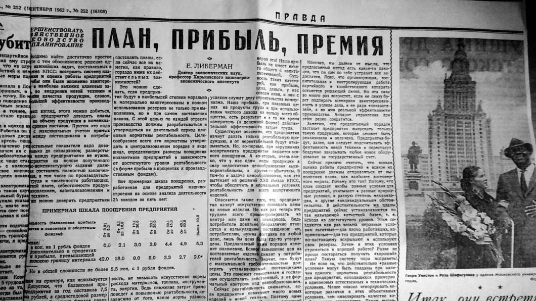 В сентябре 1962 года в «Правде» появилась статья харьковского профессора Евсея Либермана «План, прибыль, премия». Ее читали взахлеб. Мысли профессора произвели впечатление на первого секретаря ЦК Хрущева, и 20 октября 1964 года «Правда» напечатала новую статью Либермана «Еще раз о плане, прибыли и премии».