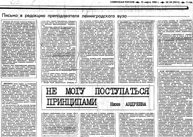 Попыткой повлиять на настроения в горбачевские времена, но с прямо противоположных позиций, стала полосная статья Нины Андреевой под названием «Не могу поступаться принципами», опубликованная 11 марта 1988 года в «Советской России».