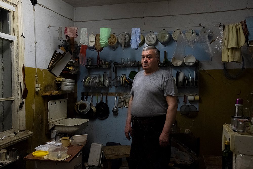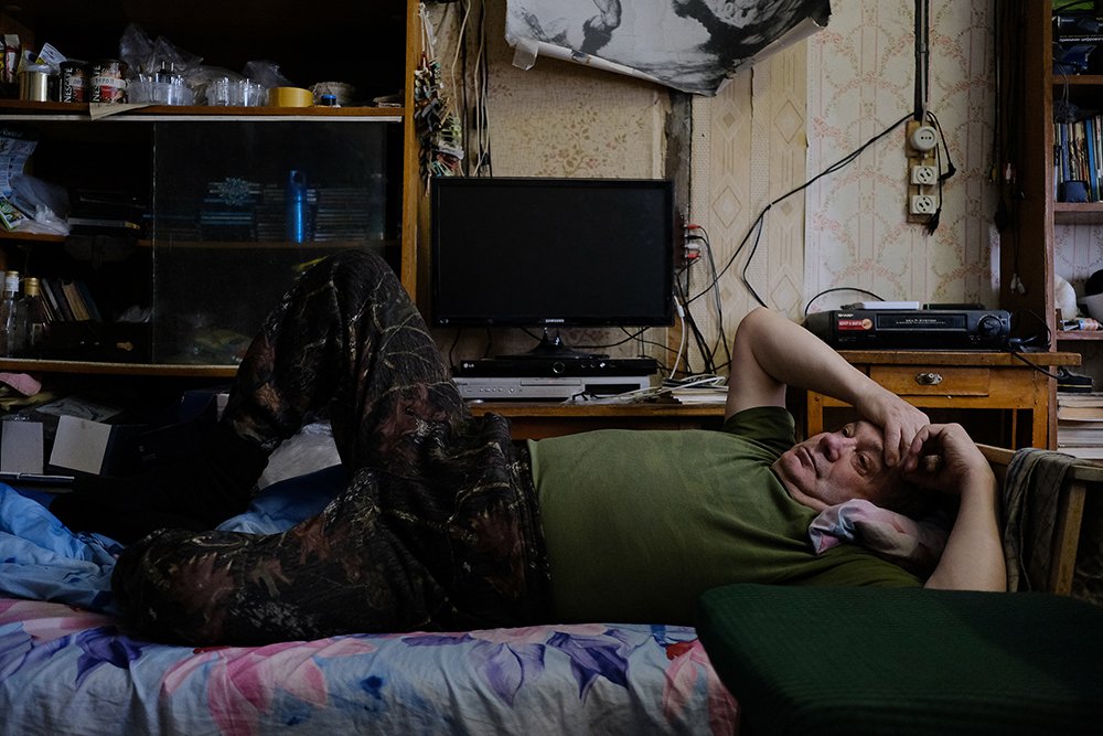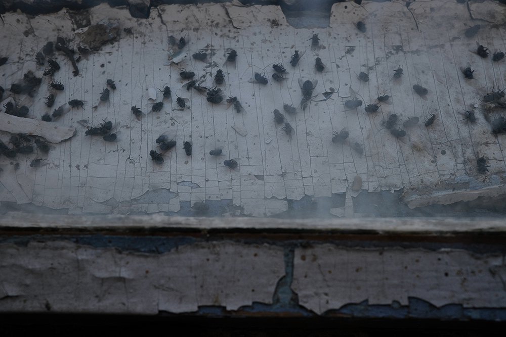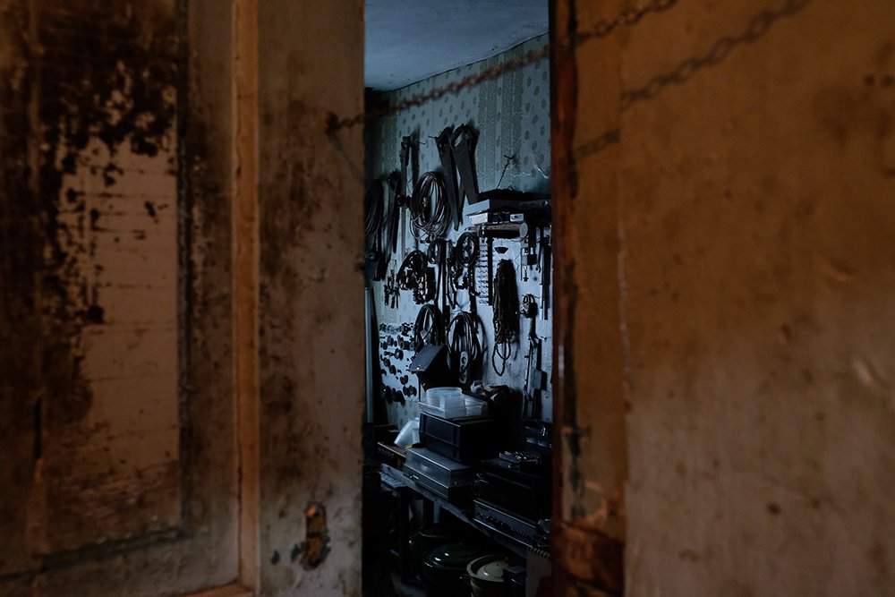 Внутри дома — четыре комнаты и будто бы бесконечный тёмный коридор, по всей длине которого развешана одежда: флисовые рубашки, камуфляжные куртки, спецовка. При входе пахнет сыростью и одиночеством, свежерастаявшим снегом и пылью. Рядом комнатка, в ней несколько гудящих коробов, пластиковые каски, стол.