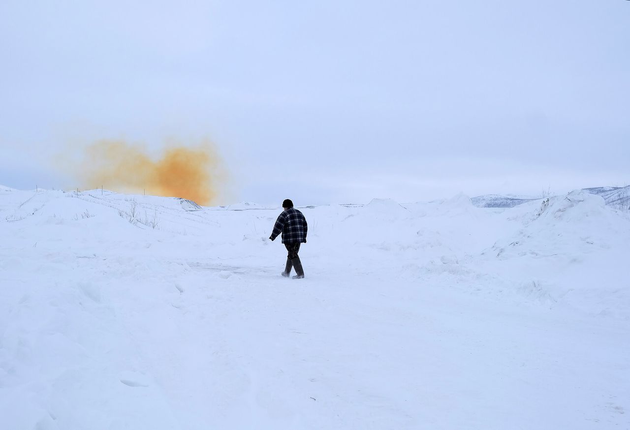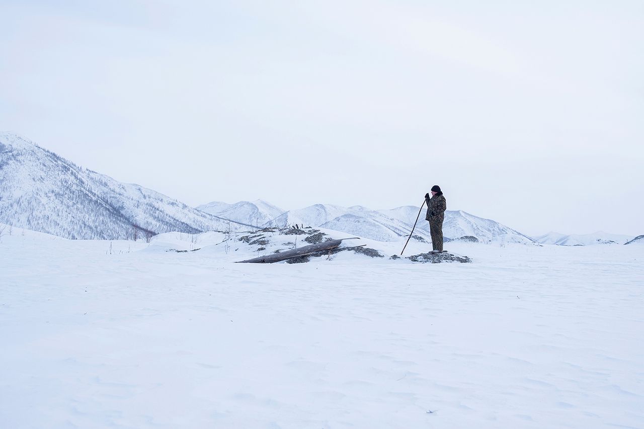 Погода, по местным меркам, тёплая — всего минус двадцать, но пронзительный ветер заставляет кутаться в шарф и пуховик. Я иду следом за Владимиром Куклиным. Он одет в камуфляжную форму и старые валенки, в его руках длинный посох, делающий его похожим на библейского пророка. Куклин опирается на него, чтобы выбраться из очередной снежной ямы.