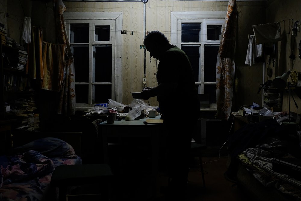 Комната полнится звуками, к тиканью часов и гудению люминесцентных ламп добавляется тяжёлое шипение тающего снега. Другого способа добыть воду тут нет: за прошедшие годы от поселковой скважины не осталось и следа.