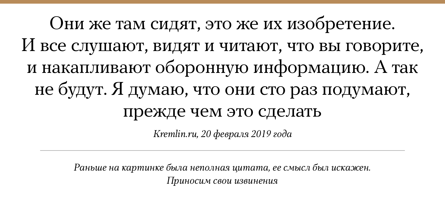 Президент России Владимир Путин заявил, что угроза отключения России от глобального интернета существует, и к ней нужно подготовиться. Однако Западу невыгодна изоляция России в экономическом и политическом плане. Таким образом он прокомментировал рассмотрение законопроекта, который позволит российским властям контролировать точки соединения российского сегмента интернета с внешним миром. 12 февраля Госдума одобрила законопроект в первом чтении. Поправка. Первоначально материал содержал неполную цитату президента, искажающую ее смысл. Редакция приносит извинения читателям.