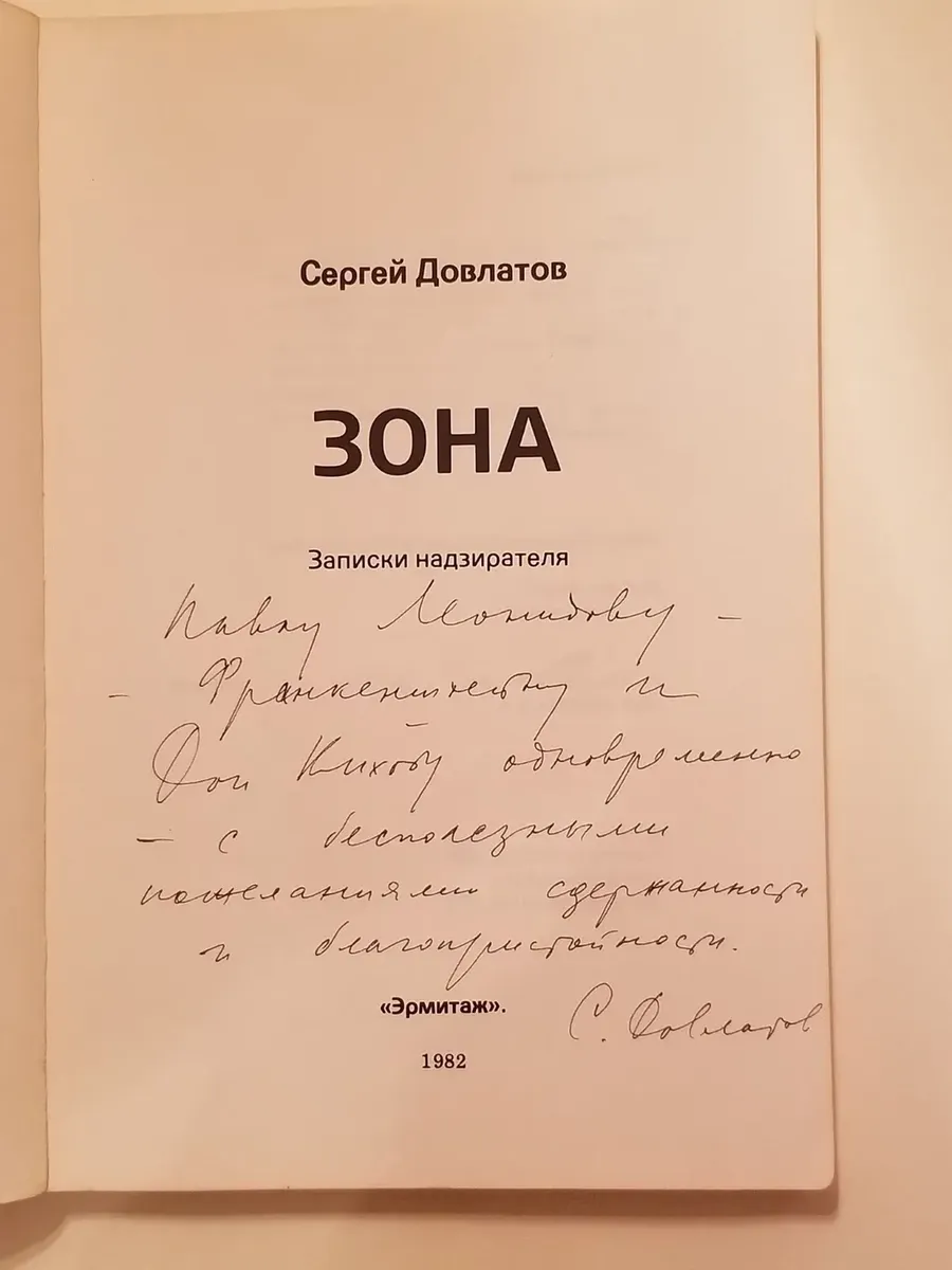 «Павлу Леонидову — Франкенштейну и Дон Кихоту одновременно — с бесполезными пожеланиями сдержанности и благопристойности. С. Довлатов».