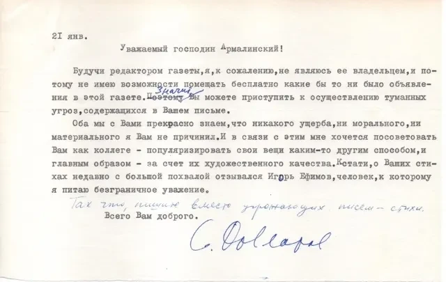 «Пишите вместо угрожающих писем — стихи. Всего Вам доброго. С. Довлатов».