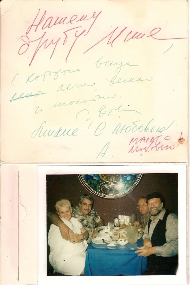 —Миша Гулько — известнейший певец-эмигрант, его называют крестным отцом русского шансона, человек, который первым записал на пластинке «Поручика Голицына», «Мурку», «Институтку», придал им каноническое звучание. В 2009 году я сделал литературную обработку его мемуаров «Судьба эмигранта». В числе прочего там есть воспоминания о Довлатове и их общая фотография, полароидный снимок, сделанный в ресторане «Приморский». На обороте надпись рукой Довлатова: «Дорогому Мише, с которым всегда легко и приятно».