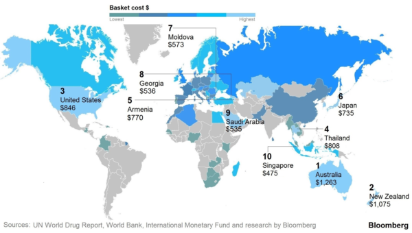 Агентство Bloomberg провело ежегодное исследование рынка и возможности граждан стран в покупке наркотиков. Во время составления рейтинга агентство учитывало предполагаемые затраты на «корзину греха», в которую входят грамм кокаина, амфетамина, марихуаны и грамм опиоидов. Стоимость «стандартных запасов наркотиков» сравнили со средним недельным заработком в странах.
