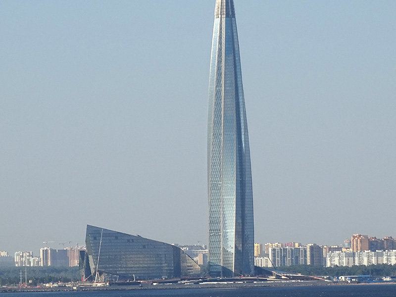 "Лахта Центр" визуально напоминает ледяной торос, а соседнее многофункциональное здание - расколотый айсберг. Шпилеобразная форма башни символизирует силу воды, а специфический стеклянный фасад позволяет небоскребу менять цвет в зависимости от положения солнца. Строительство комплекса с 462-метровым небоскребом началось в 2012 году. Небоскреб в 87 этажей стал самым северным в мире и вторым по высоте строением в России и Европе. Он на 88 метров превосходит московскую "Башню Федерации", уступая лишь 540-метровой Останкинской телебашне.