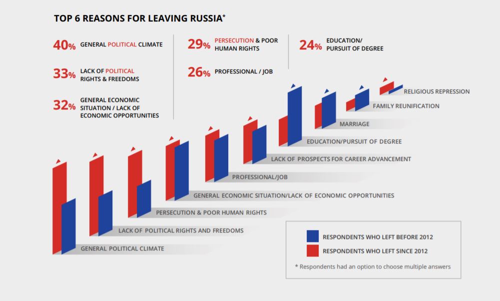Почему уезжают. Главные причины, названные в ходе опроса российскими эмигрантами, уехавшими в США или Европу: общая политическая атмосфера в России (40%), отсутствие политических прав и свобод (33%), общая экономическая ситуация (32%), преследования и нарушения прав человека (29%), профессиональные причины (26%), образование/получение диплома (24%).