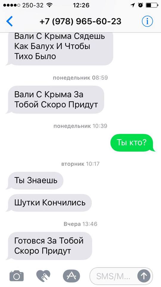 собрались издавать газету на украинском языке, мне стали поступать более конкретные требования, вышел первый номер, и начались угрозы. После того, как я несколько раз посетил суд над Балухом, стали приходить эсэмэски, что "ты сядешь, как Балух, ты у себя дома найдешь патрон, вали с Крыма" и прочее. Понятно, что меня этим так не проймешь сразу, но они стали действовать более мерзко. Они сначала позвонили моей матери, потом она стала получать такие же сообщения, как и я, что "твой сын сядет, если не уедет". После этого через какое-то время они стали писать сообщения моим родственникам, моей сестре, что "твой брат сядет, пусть он уезжает из Крыма". Родственники у меня люди не публичные, очень пугливые, скажем так, и они все советовали мне, чтобы я покинул Крым.