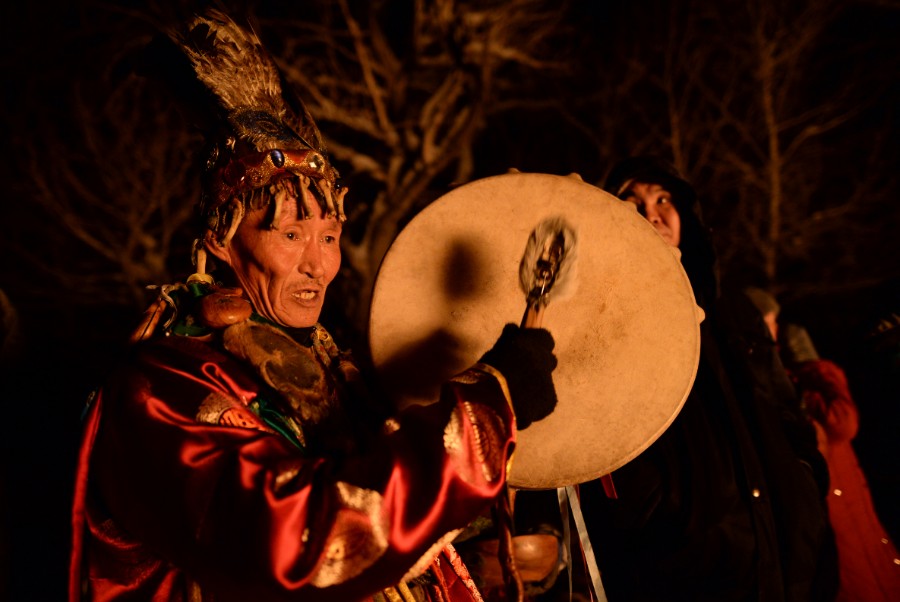 Шаман в Кызыле проводит обряд встречи солнца, первые лучи которого означают наступление Шагаа — нового года по лунному календарю, 2016 годФото: Александр Кряжев/РИА Новости