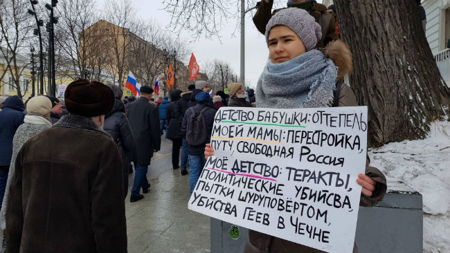 Демонстранты скандировали "Россия будет свободной!", "Путин - вор!", "Россия без Путина", "Долой власть чекистов!", "Путин - позор России", "Путин - русофоб", "Свободу политзаключенным", "Всех не убьете", "Люстрации!". Колонну возглавили председатель партии ПАРНАС Михаил Касьянов, лидер "Солидарности" Илья Яшин, бывший депутат Госдумы Дмитрий Гудков, зампред "Открытой России" Владимир Кара-Мурза-младший. В марше участвовали также лидер "России будущего" Алексей Навальный и его брат, бывший политзек Олег Навальный.