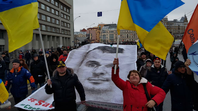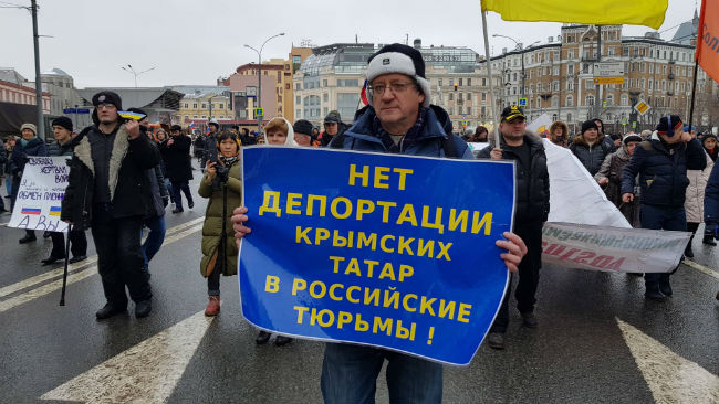 Некоторые участники московской акции несли украинские флаги, полотнище с портретом политзека Олега Сенцова, плакаты в защиту крымских татар - жертв репрессий в Крыму.