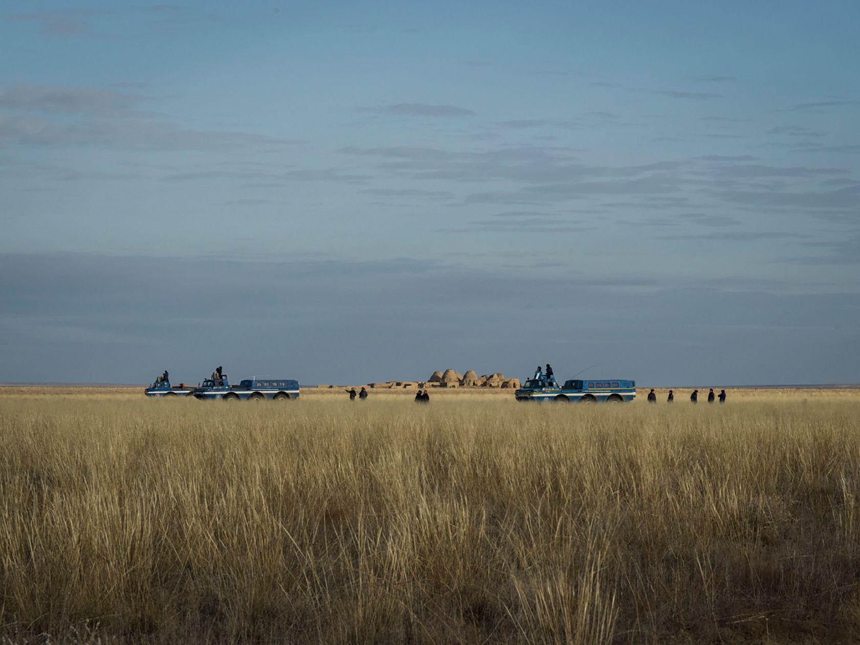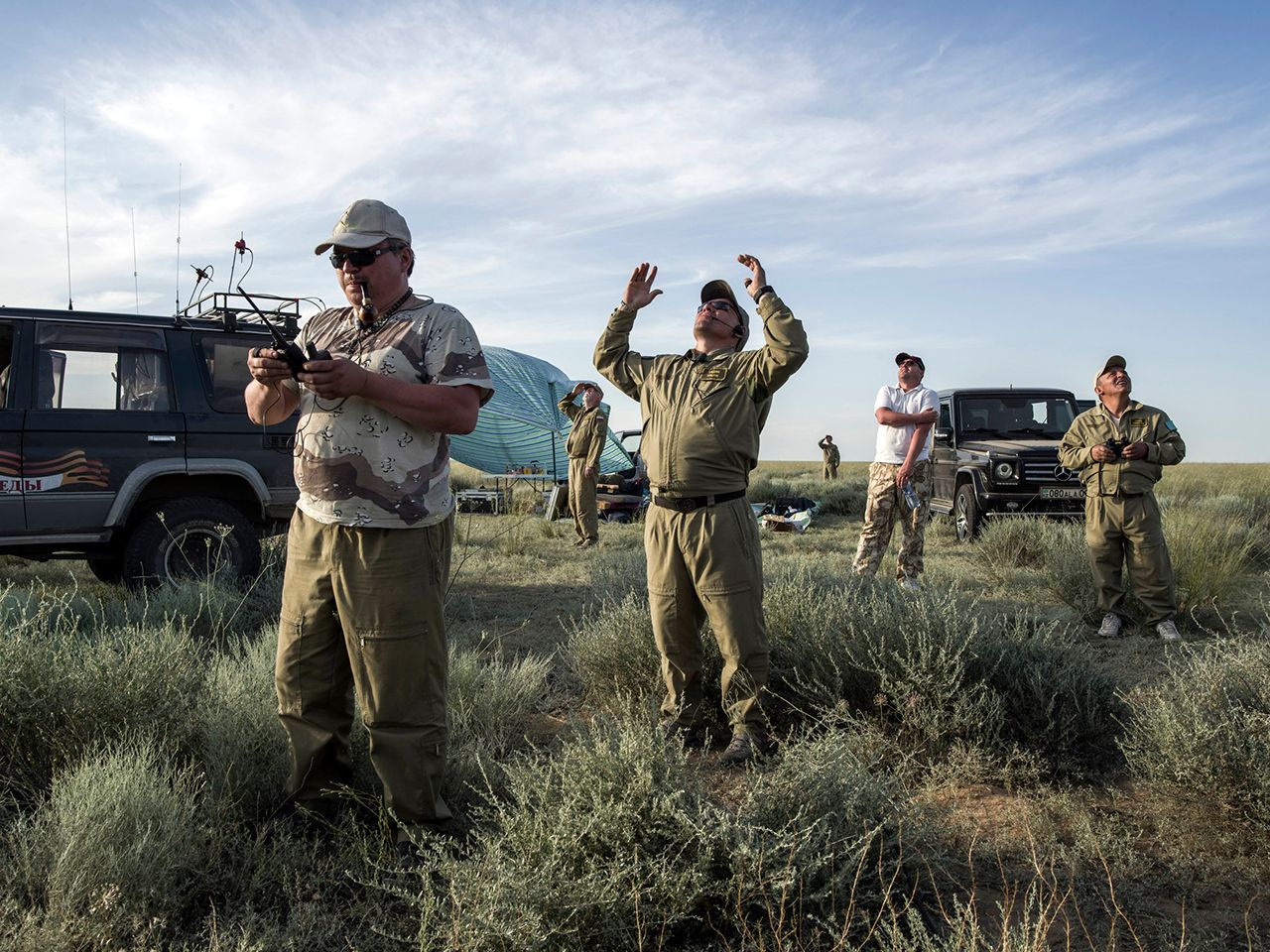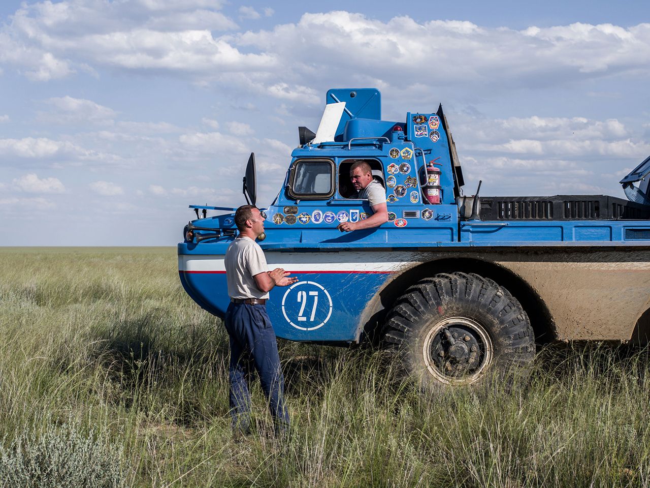 Andrew McConnell / Музей космонавтики Наземная поисково-спасательная группа ожидает, когда космический корабль «СоюзТМА-15М» окажется в зоне видимости. Казахстан, июнь 2015 года.Andrew McConnell / Музей космонавтики Поисково-спасательная группа в ожидании спуска корабля «Союз МС-01». Вездеход из отряда «Синяя птица» предназначен для поиска и транспортировки приземлившихся космических кораблей даже в неблагоприятных погодных условиях. Казахстан, июнь 2015 года.Andrew McConnell / Музей космонавтики Поисково-спасательные машины «Синие птицы» перед приземлением спускаемого аппарата «Союз МС-01». Казахстан, октябрь 2016 года.Andrew McConnell / Музей космонавтики Сотрудники поисково-спасательного отряда помогают астронавту Андреасу Могенсену (Дания) выйти из корабля «СоюзТМА-16М». Казахстан, сентябрь 2015 года.Andrew McConnell / Музей космонавтики Космический корабль «Союз ТМА-19М» после приземления. Казахстан, июнь 2016 года.Andrew McConnell / Музей космонавтики Россиянин Геннадий Падалка после приземления на космическом корабле «СоюзТМА-17М». На борту МКС свежие продукты — редкость, поэтому космонавтов и астронавтов по прибытии часто угощают фруктами или овощами. Падалка стал мировым рекордсменом по суммарной продолжительности пребывания в космосе, проведя на орбите в общей сложности 878 дней. Казахстан, сентябрь 2015 года.Andrew McConnell / Музей космонавтики Ракета «СоюзТМА-19М» во время транспортировки к стартовой площадке № 1. Казахстан, космодром Байконур, декабрь 2015 года.Andrew McConnell / Музей космонавтики Мальчик играет с обломками ступеней ракеты-носителя. После отделения от ракеты ступени падают на землю на расстоянии более 600 км от космодрома Байконур. Казахстан, март 2018 года.Andrew McConnell / Музей космонавтики Лошади пасутся возле заброшенных зданий. Раньше здесь находился завод по производству резины. Казахстан, Карагандинская область, город Саран, март 2018 года.Andrew McConnell / Музей космонавтики Три кресла в казахской степи в районе приземления космического корабля. На протяжении многих лет космонавты и астронавты садятся в такие кресла, после того как покинут спускаемый аппарат космического корабля «Союз». Казахстан, октябрь 2016 года.