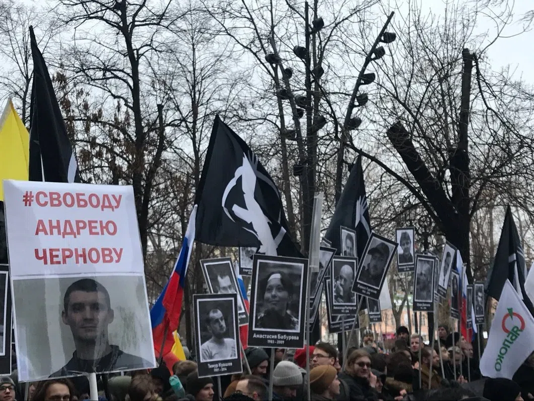 На акции в Москве присутствует колонна «Обмен всех на всех», участники марша с флагами «Бессрочка» (участники «Бессрочного протеста»), члены партии «Яблоко» и движения «Солидарность», а также сторонники политика Алексея Навального, сообщает корреспондент «Новой».