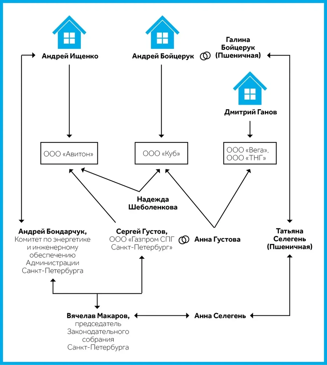 Если проследить связи между всеми шестью персонами (Макаров — Густов — Бондарчук — Ищенко — Бойцерук — Ганов), видно, что они образуют скорее не линии, а сложные многоугольники (см. схему), в которых все соединяются со всеми. Так, супруга гендиректора ООО «Авитон», частично принадлежащего Ищенко, Надежда Шебаленкова является вместе с Анной Густовой совладелицей упомянутого ООО «Куб», где директорствует Бойцерук. Далее, дочерняя структура «Авитона» ООО «ТК Мурино» снимает помещение у густовского ООО «ТНГ» под управлением Ганова. Кроме того, бывшая фамилия супруги Бойцерука Галины — Пшеничная(в сети «Одноклассники» она пишет ее в скобках). Такую же фамилию носила до замужества Татьяна Селегень, сватья Вячеслава Макарова (их дети женаты). Сестра Татьяны Селегень Вера Пшеничная — совладелица компании «Петрострой», половина акций которой до мая 2016 г. принадлежала дочери спикера ЗакСа Анне Селегень. «Деловой Петербург» рассказывал, как по удивительному совпадению за несколько месяцев 2016 года «Петрострой» довел портфель контрактов с «Теплоэнерго» почти до полумиллиарда рублей. После этого доля Анны была передана ее свекру Владимиру Селегеню.