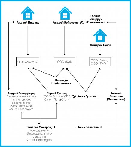 Если проследить связи между всеми шестью персонами (Макаров — Густов — Бондарчук — Ищенко — Бойцерук — Ганов), видно, что они образуют скорее не линии, а сложные многоугольники (см. схему), в которых все соединяются со всеми. Так, супруга гендиректора ООО «Авитон», частично принадлежащего Ищенко, Надежда Шебаленкова является вместе с Анной Густовой совладелицей упомянутого ООО «Куб», где директорствует Бойцерук. Далее, дочерняя структура «Авитона» ООО «ТК Мурино» снимает помещение у густовского ООО «ТНГ» под управлением Ганова. Кроме того, бывшая фамилия супруги Бойцерука Галины — Пшеничная (в сети «Одноклассники» она пишет ее в скобках). Такую же фамилию носила до замужества Татьяна Селегень, сватья Вячеслава Макарова (их дети женаты). Сестра Татьяны Селегень Вера Пшеничная — совладелица компании «Петрострой», половина акций которой до мая 2016 г. принадлежала дочери спикера ЗакСа Анне Селегень. «Деловой Петербург» рассказывал, как по удивительному совпадению за несколько месяцев 2016 года «Петрострой» довел портфель контрактов с «Теплоэнерго» почти до полумиллиарда рублей. После этого доля Анны была передана ее свекру Владимиру Селегеню.