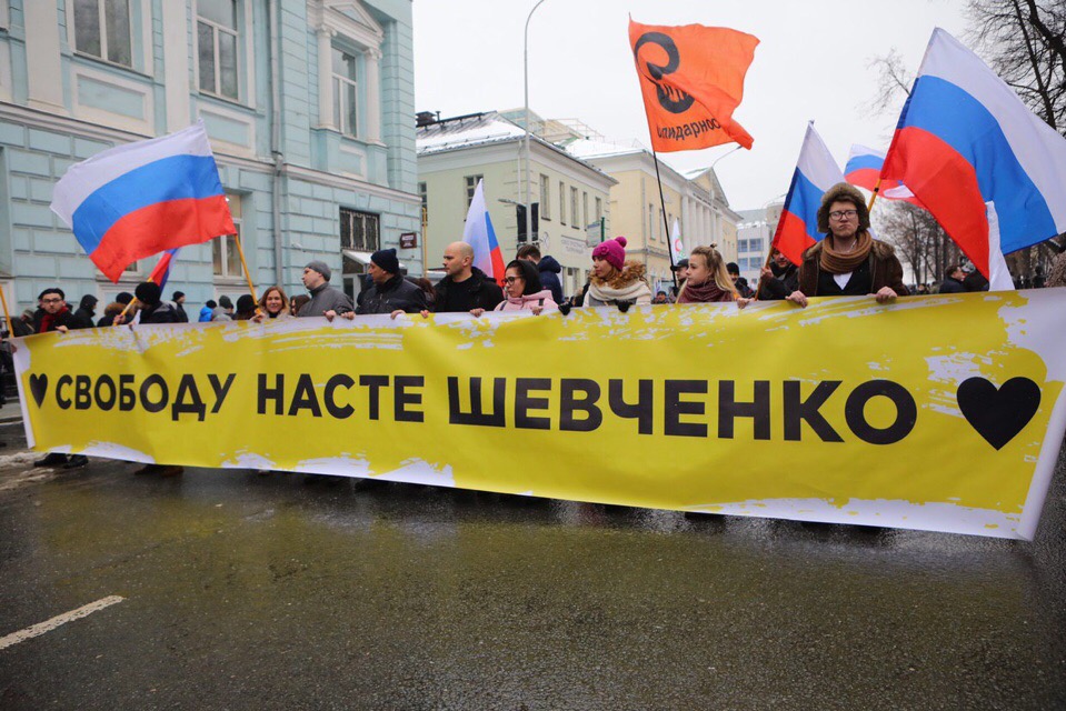 На марше в Москве и других городах мы говорили о Насте Шевченко. Она была участником и организатором всех акций памяти Немцова в Ростове. Но сейчас она под домашним арестом, ей грозит уголовный срок — поэтому мы выходим за нее.
