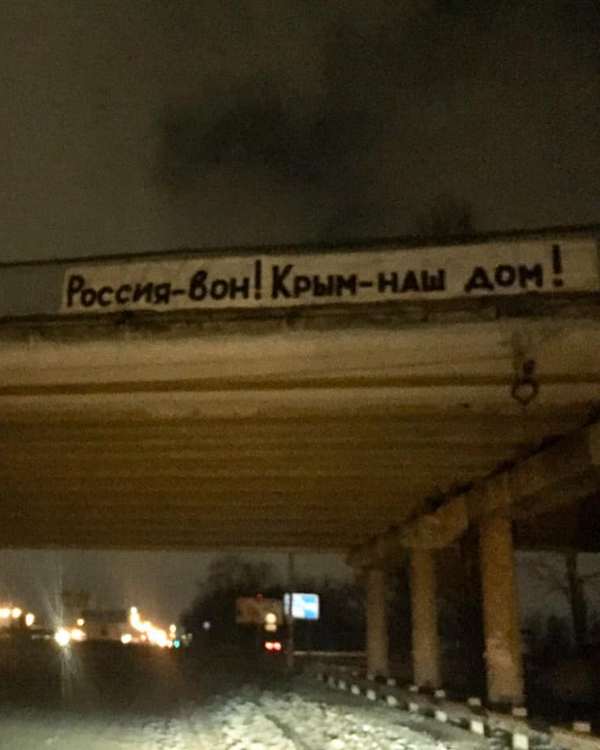 На мосту в Симферополе в ночь на вторник неизвестные активисты вывесили растяжку с надписью "Россия - вон! Крым - наш дом!". Фотографию баннера поместил на своей ФБ-странице председатель Меджлиса крымскотатарского народа Рефат Чубаров.