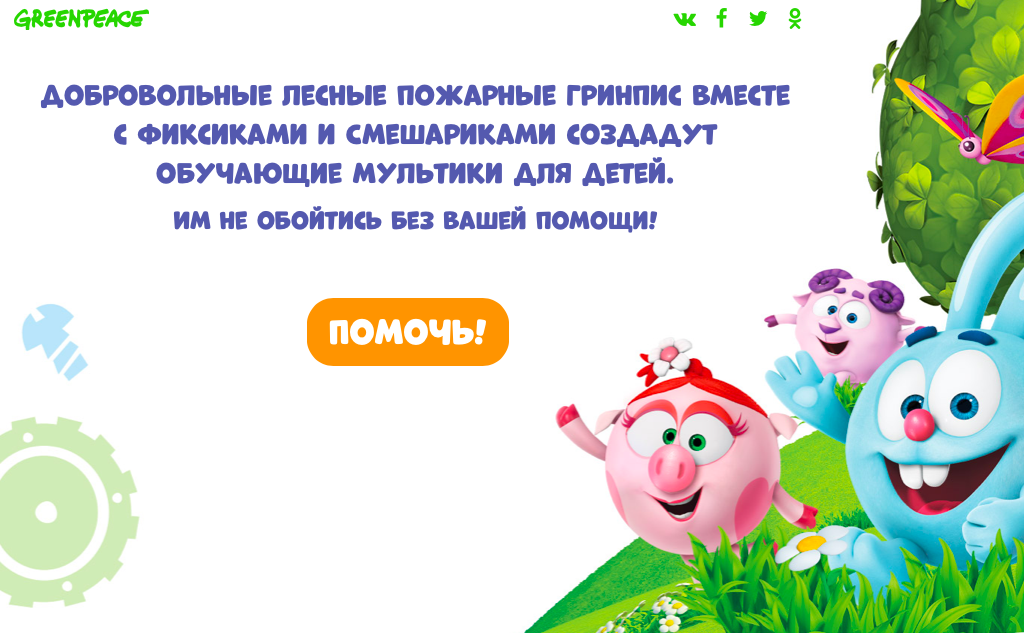 Анимационные студии пошли навстречу «Гринпис» и разрешили бесплатно пользоваться брендами «Смешарики» и «Фиксики». Чтобы создать мультипликационные фильмы, экологическая организация запустила краудфандинговые проекты на своем сайте и на Planeta.ru. В кампании участвует известный артист и музыкант Алексей Кортнев.